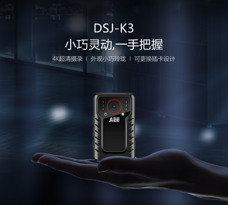 AEE DSJ-K5執法記錄儀采用新一代高性能主控芯片,最4k全高清視頻分辨率,擁有動態2160P/30幀攝像,拍照可達4800萬像素,支持紅外夜視功能;3000mAh內置鋰電池,拍攝時長可達12小時;IP68防護等級和6米防跌落設計,歷史軌跡查詢